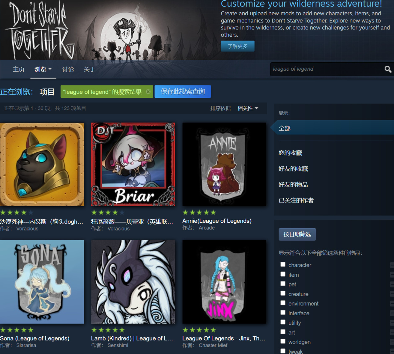 画风有点像英雄联盟放在饥荒联机版,于是我去饥荒的创意工坊,真搜到了好多mod!