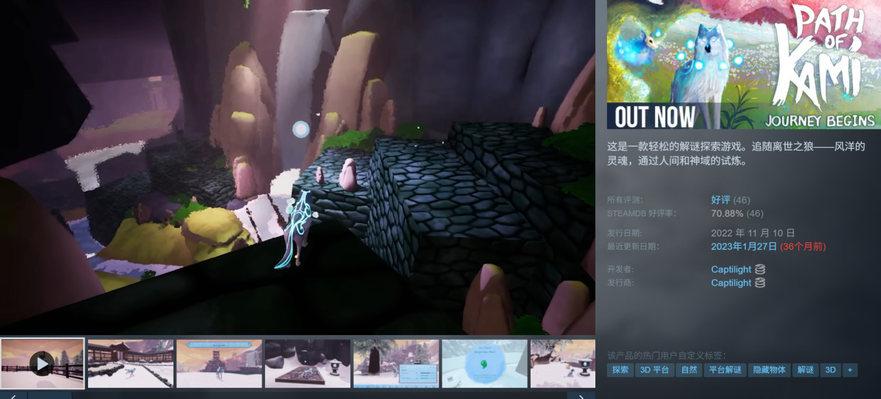 第三个系列是一款休闲探索解谜游戏Path of Kami: Journey Begins,好评70.88%,本体带着dlc都跑路了,还好留下demo,个人觉得画风不错,等玩过了再反馈感受,如果好的话或许在steam之外的平台还能拿到本体甚至完整包。