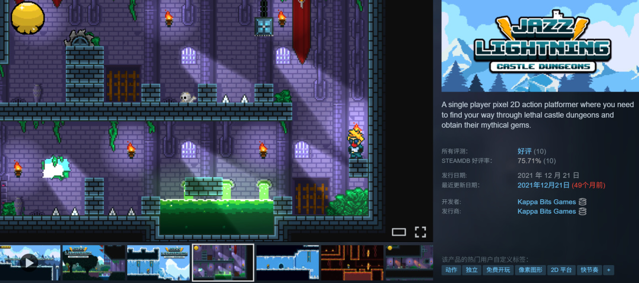 强烈推荐 Jazz Lightning : Castle Dungeons 爵士闪电:城堡地牢,原价15现在还能免费领,明亮轻快的像素风格,等我sheepy终于想起来通关后就玩他吧。