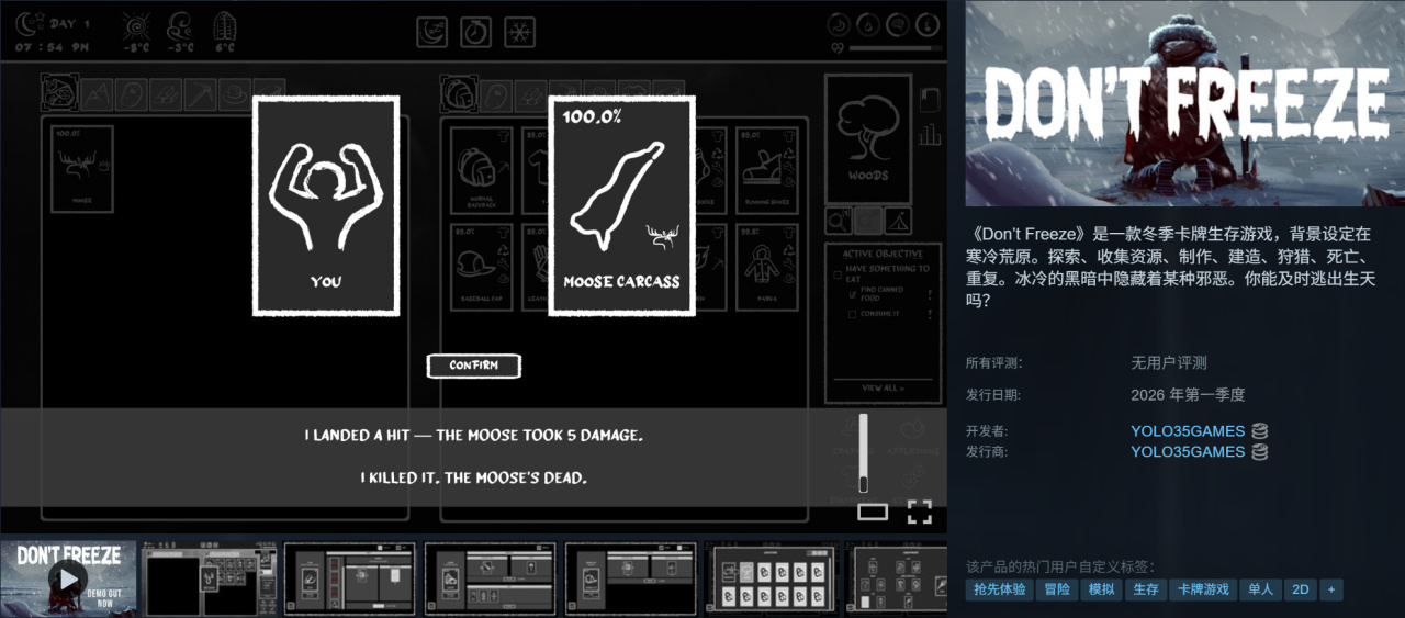 很巧的是下一款《冻僵》Don't Freeze无论名字和玩法都很像饥荒Don't Starve,都是生存采集,但是多了卡牌元素。目前有demo可以玩