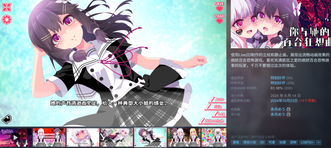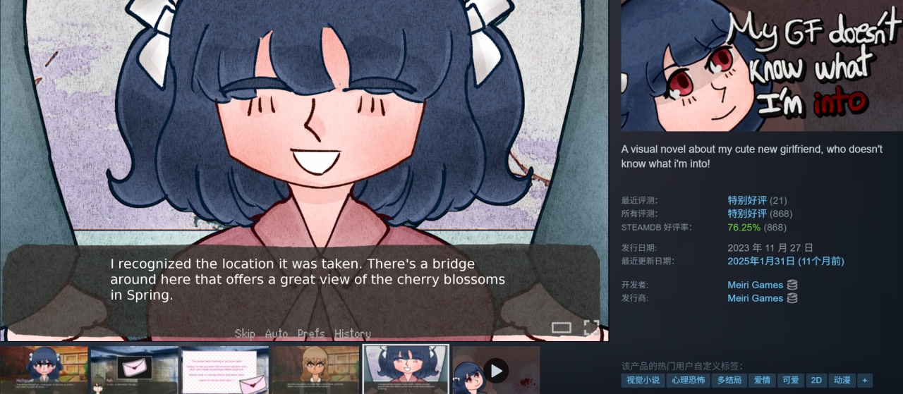 第三个系列是 My GF Doesn't Know What I'm Into,我女友不知道我爱啥,又是在库里很久忘了有本体,如今三个DLC下架,特别好评值得入手,这个画风的视觉小说还不错。