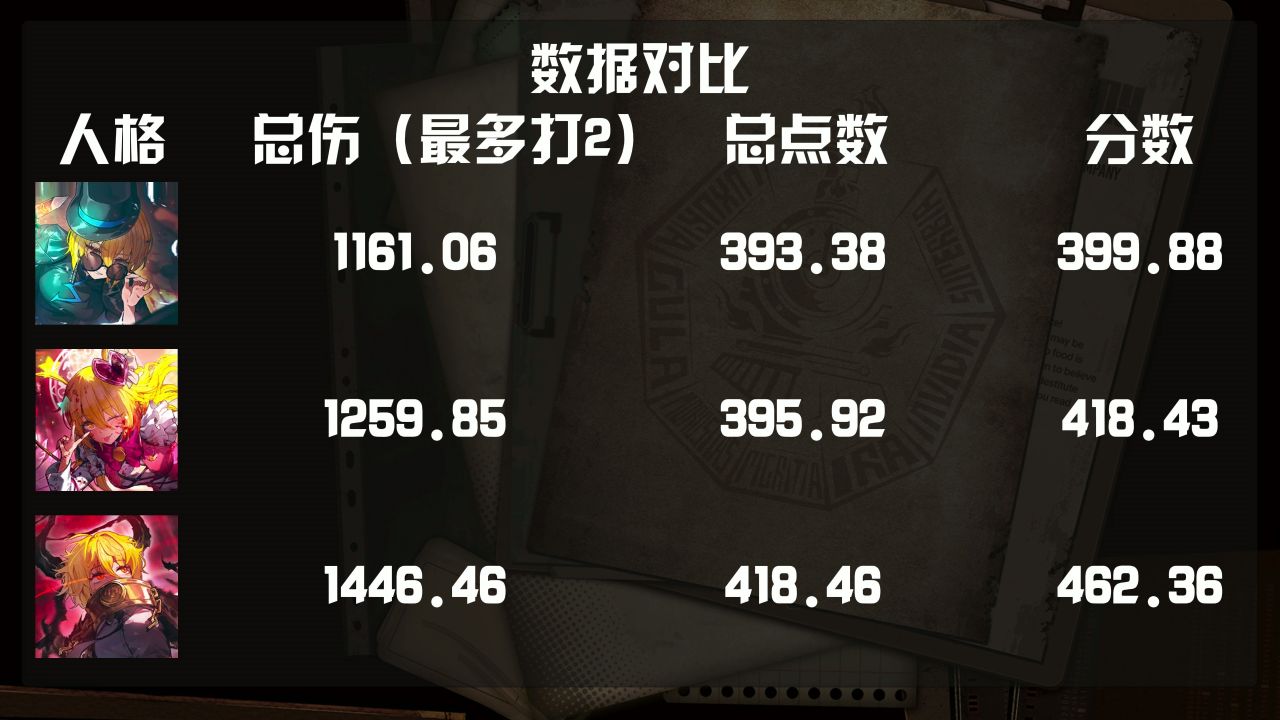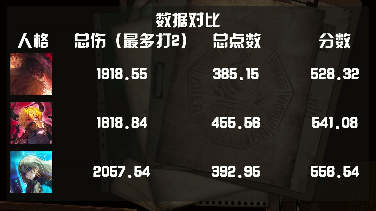 排名分数:两种环境下12回合拼点点数*1加伤害*0.35,整体再除以2,其他方面不记分,可自行根据需要的方面上下调整排名。(所有三灯人格点数和伤害的比值约为0.35)