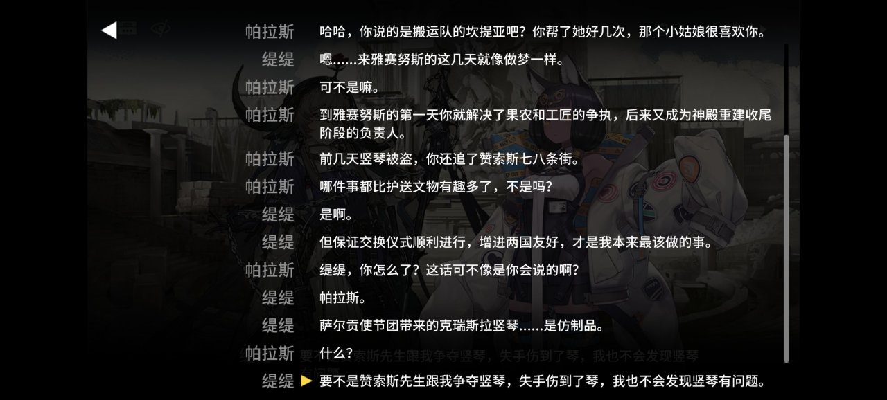 缇缇觉得这个事不对,两国交流的时候说的是真品,自己接到任务的时候也是以为是真品,结果现在是个冒牌货,于是为了两国交好,做好了准备做恐怖分子给这个竖琴劈了当柴烧然后做流浪汉等着被罗德岛捡到的准备。