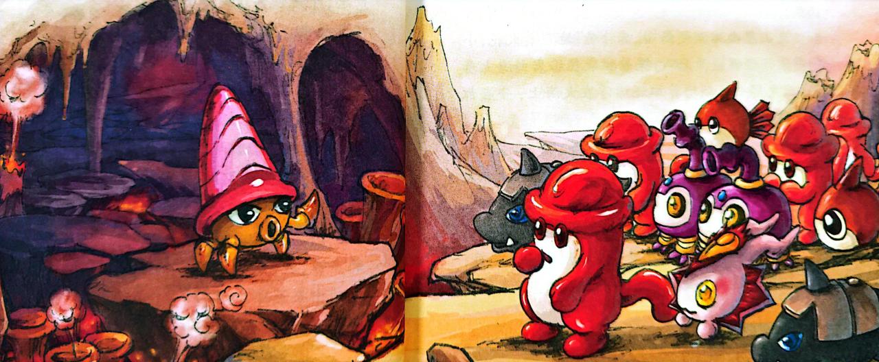 满头雾水的火炎贝见状连忙拦住往外跑的精灵询问情况,结果它们只顾逃命,拽着火炎贝就像赶快离开。火炎贝只好再拽住自己的朋友吉尔——它是世代居住在火山洞里的精灵。谁知吉尔和其它精灵一样张皇失措、有口难言,拉锯了半天,吉尔才勉强冷静下来,道清了原委。