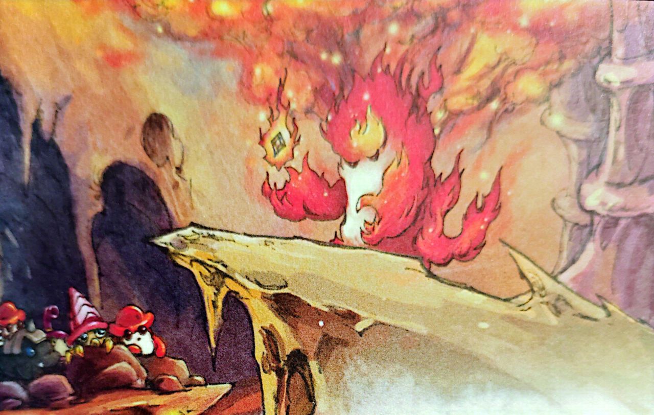 她只得朝精灵试探性的对话,这个精灵意外的友善,却对目前的状况一无所知:它不知道自己是谁,也不记得之前发生过什么事,就连吞食熔岩红晶都是出于肚子实在太饿而把它误当食物。它也对其它小精灵的逃离感到疑惑和沮丧。