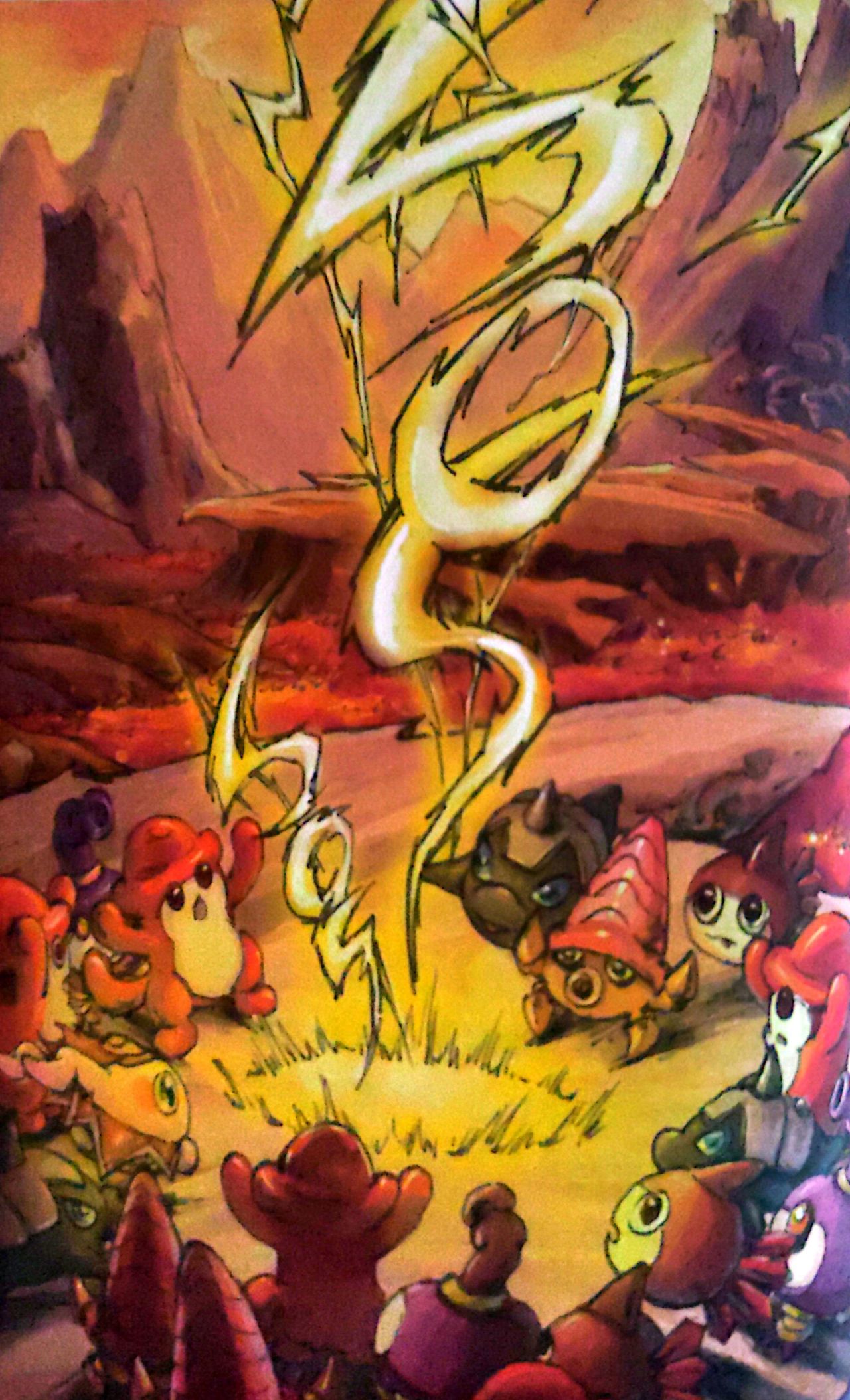 在岩浆里浴火而生的火炎贝被巨响惊醒,随即惊讶的发现火山洞里冒出滚滚浓烟。里面的小精灵慌乱地向外跑出,不顾一切地逃命。
