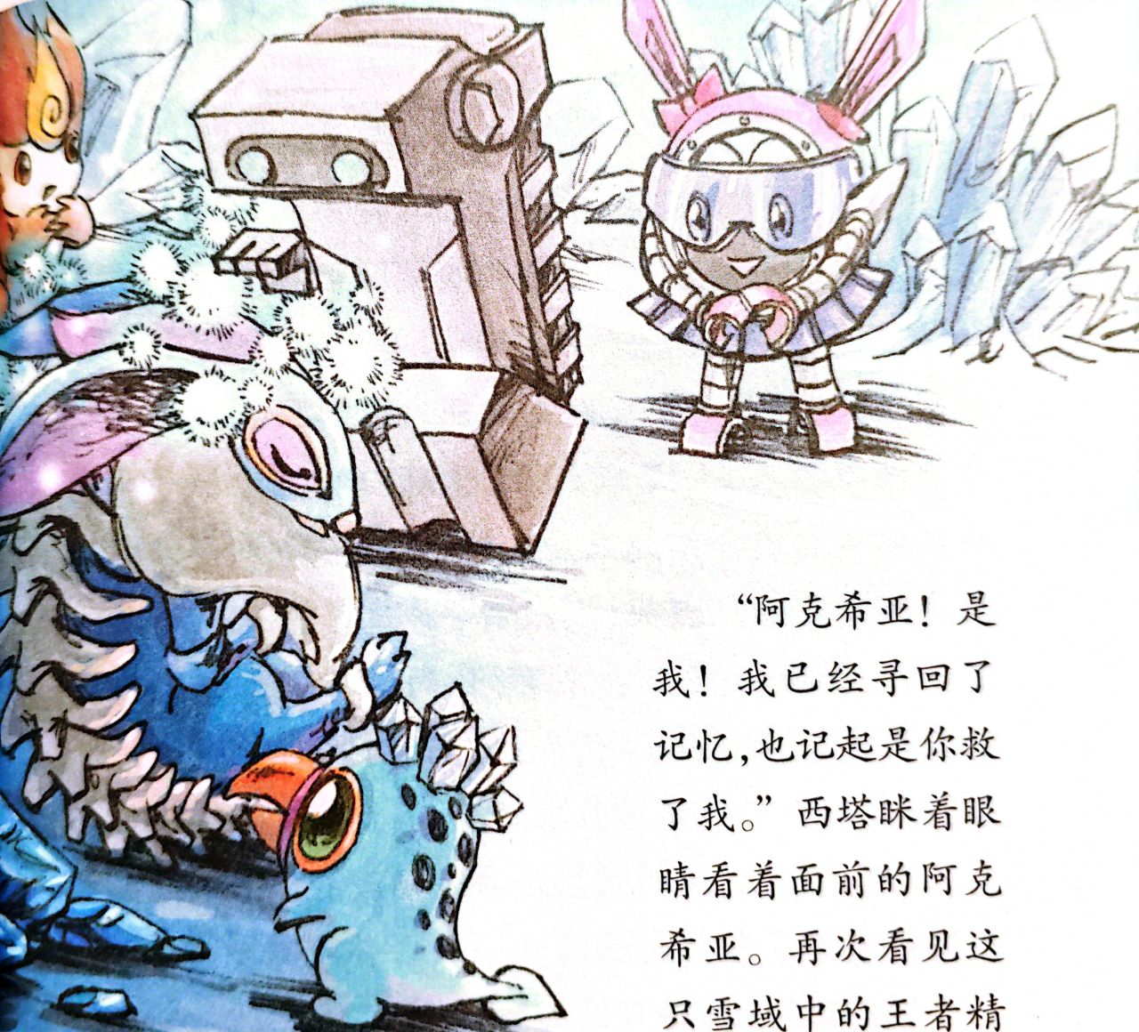 桑尼自然也很乐意,她们在机械室里到处寻找,依照机械方块的辨认,终于摸到了记忆芯片。可此时突然蹦出来一只玄冰兽,一下就撞倒了桑尼,叼起记忆芯片就往外跑。