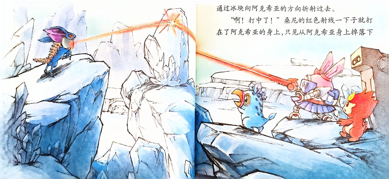 桑尼深知不能放任它这么狂暴下去,必须用强制措施来反制它了。桑尼取出射线枪🔫,但面对阿克希亚这样强大的精灵,必须要出其不意。苦思冥想下,桑尼发现了一块巨大光滑的冰块,她立刻向冰块射出射线,红色的射线折射出去,精准的命中了阿克希亚。受到剧烈冲击的阿克希亚暂时虚弱的停了下来,身上隐约掉落了一个黑色的芯片。