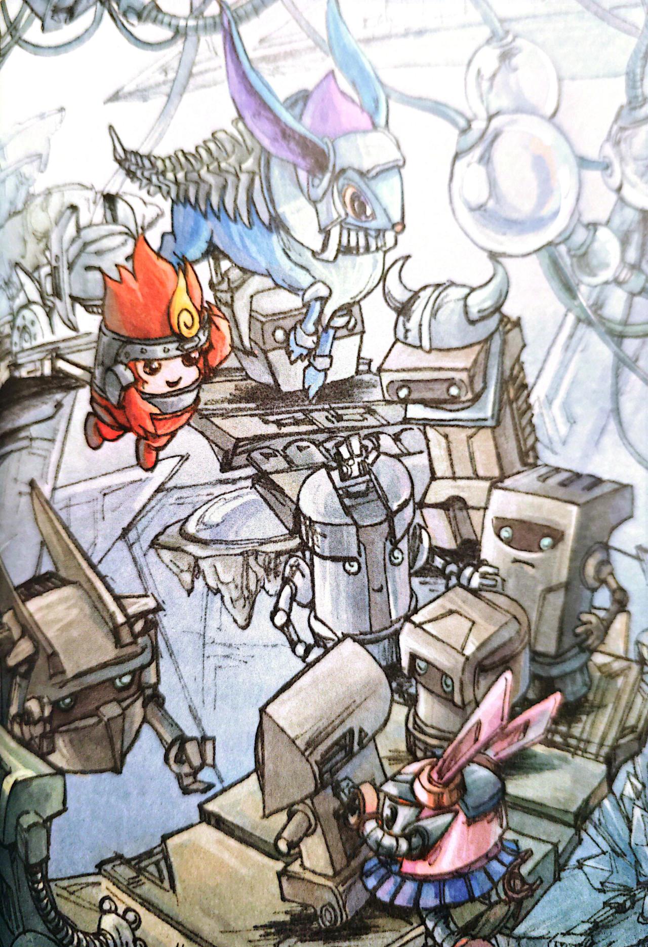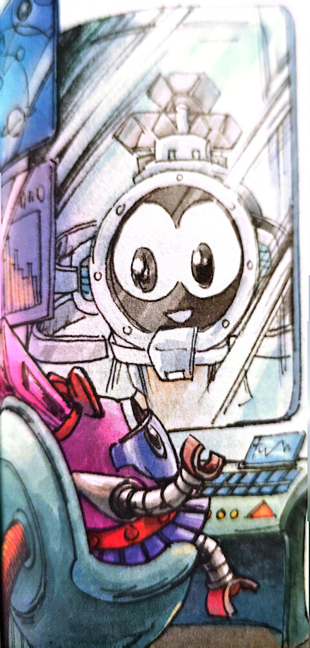 门的背后,是一片巨大的无引力空间,到处盘绕着看不见尽头的楼梯,中央是一个汇聚电流的巨大能量罐。海盗们大多飘在半空,无死角地巡视。排成长龙的机械精灵们端着材料或者原件,颤抖着向能量罐走去,它们被绑着粗粗的铁镣,还被海盗凶恶地奴役。