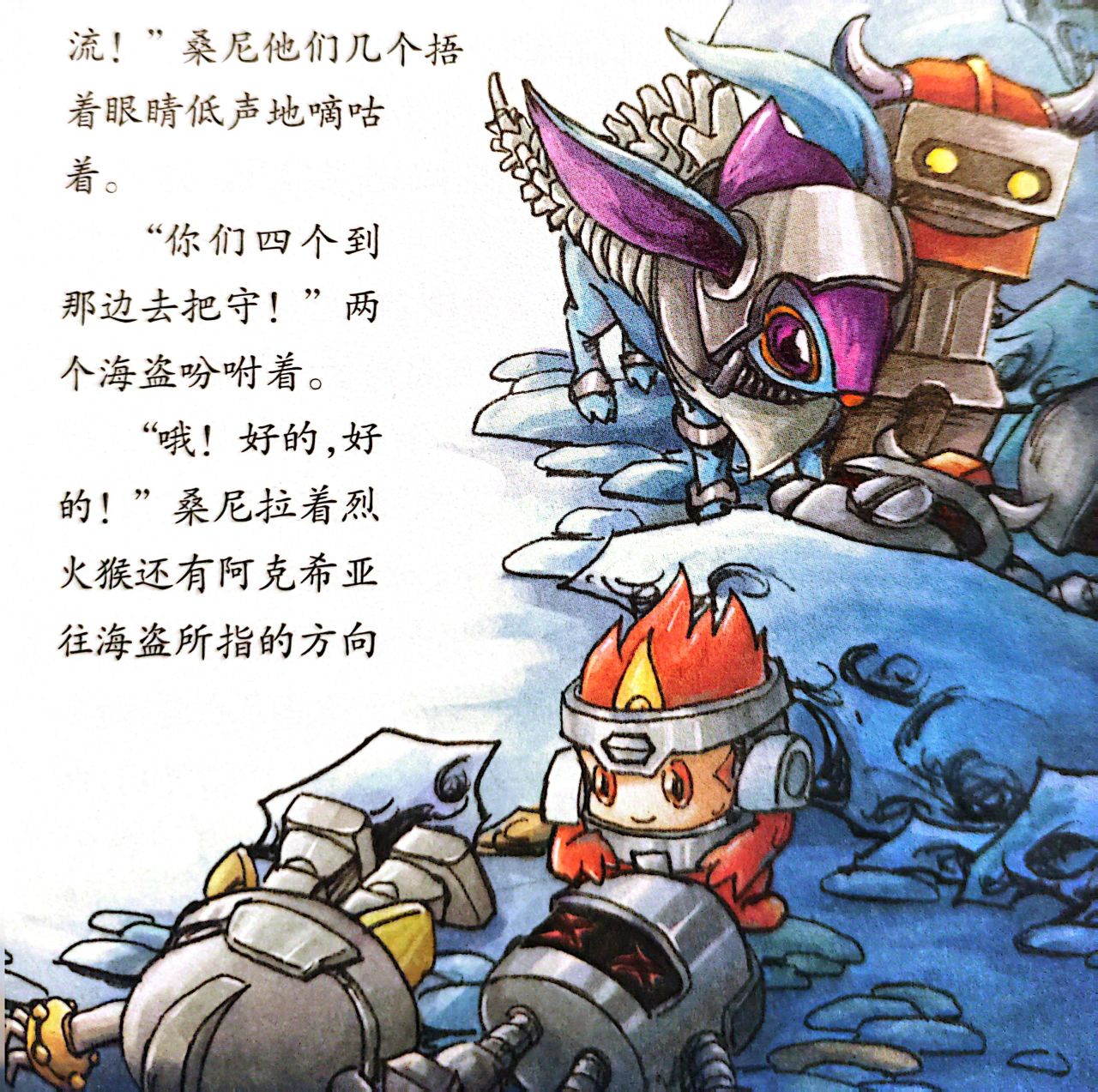 其它海盗们也被极速的寒流冻得发抖,机器臂瞬间无力,瘫倒在地上。独眼龙想要夺路而逃,却被桑尼和烈火猴挡住出口。然而独眼龙眼珠一转,以迅雷不及掩耳之势伸长机器臂,一把薅住桑尼。