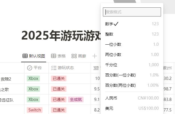 數字是最常用的,通過更改數字格式來記錄不同的數據。如整數或者小數來記錄遊戲遊玩時間;百分數來記錄成就進度;人民幣來記錄史低價和購買價。
