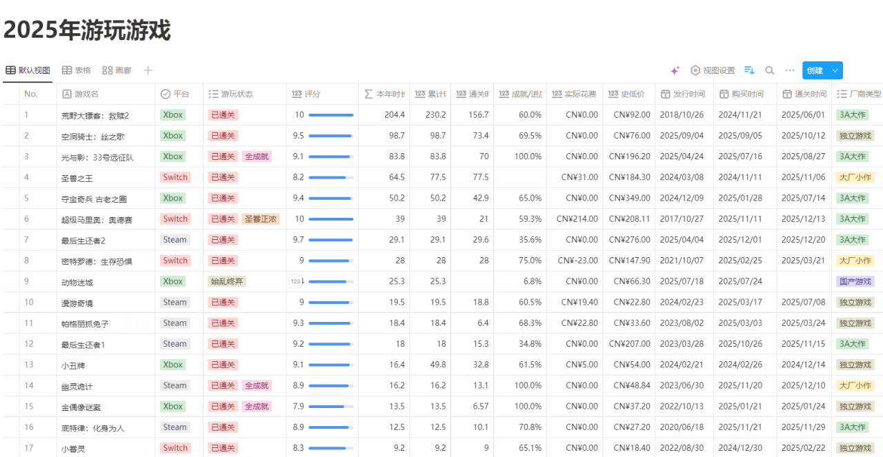 最後是公式,這種主要做一些簡單的自動計算,我會錄入遊戲的往年遊玩時間,這樣每次我更新遊戲時長時,就能自動算出我今年玩了多長時間。