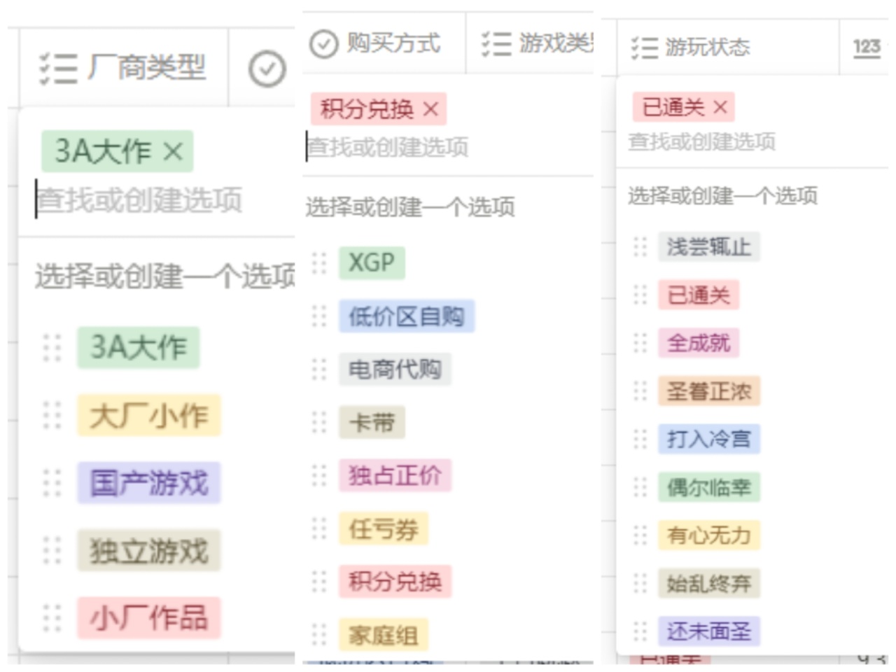 然後是多選和單選。是表格看起來好看的主要因素,軟件能夠讓你自己創建不同選項並選擇顏色。多選主要用來記錄遊玩狀態、遊戲類型;單選主要用來記錄平臺、廠商類型、購買方式。部分我自己選項內容貼在下面。