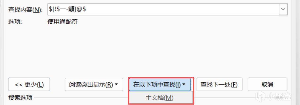 然後點擊 在以下項中查找 - 主文檔 (如果需要自定義範圍則用光標選中後選擇 當前所選內容 即可)