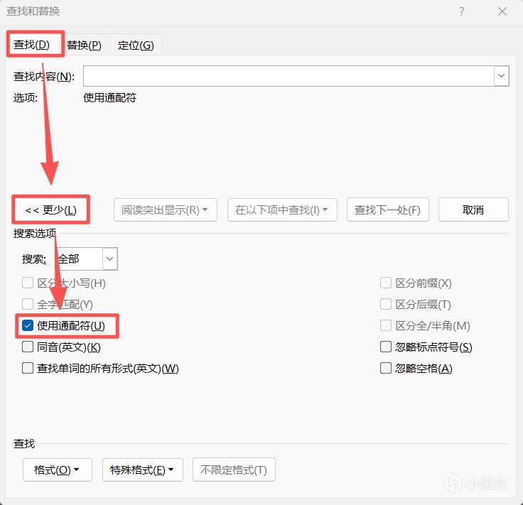 使用快捷鍵 Ctrl + H 打開 查找和替換 窗口,點擊 查找 頁面,點擊左下角的 更多 選項,勾選 使用通配符