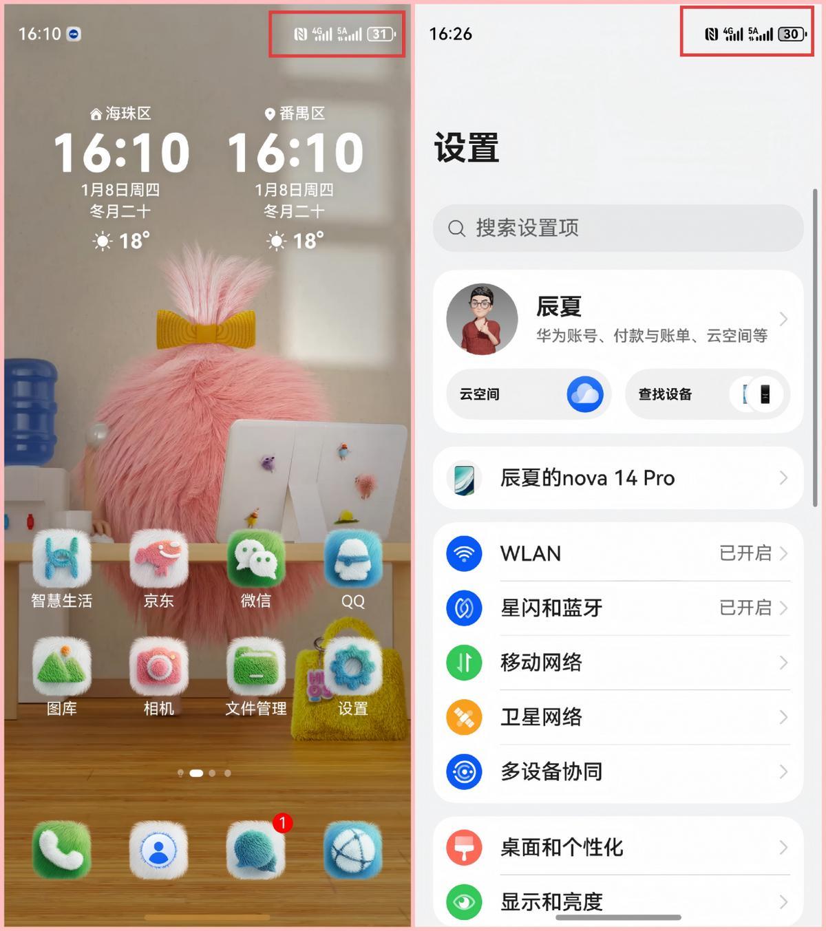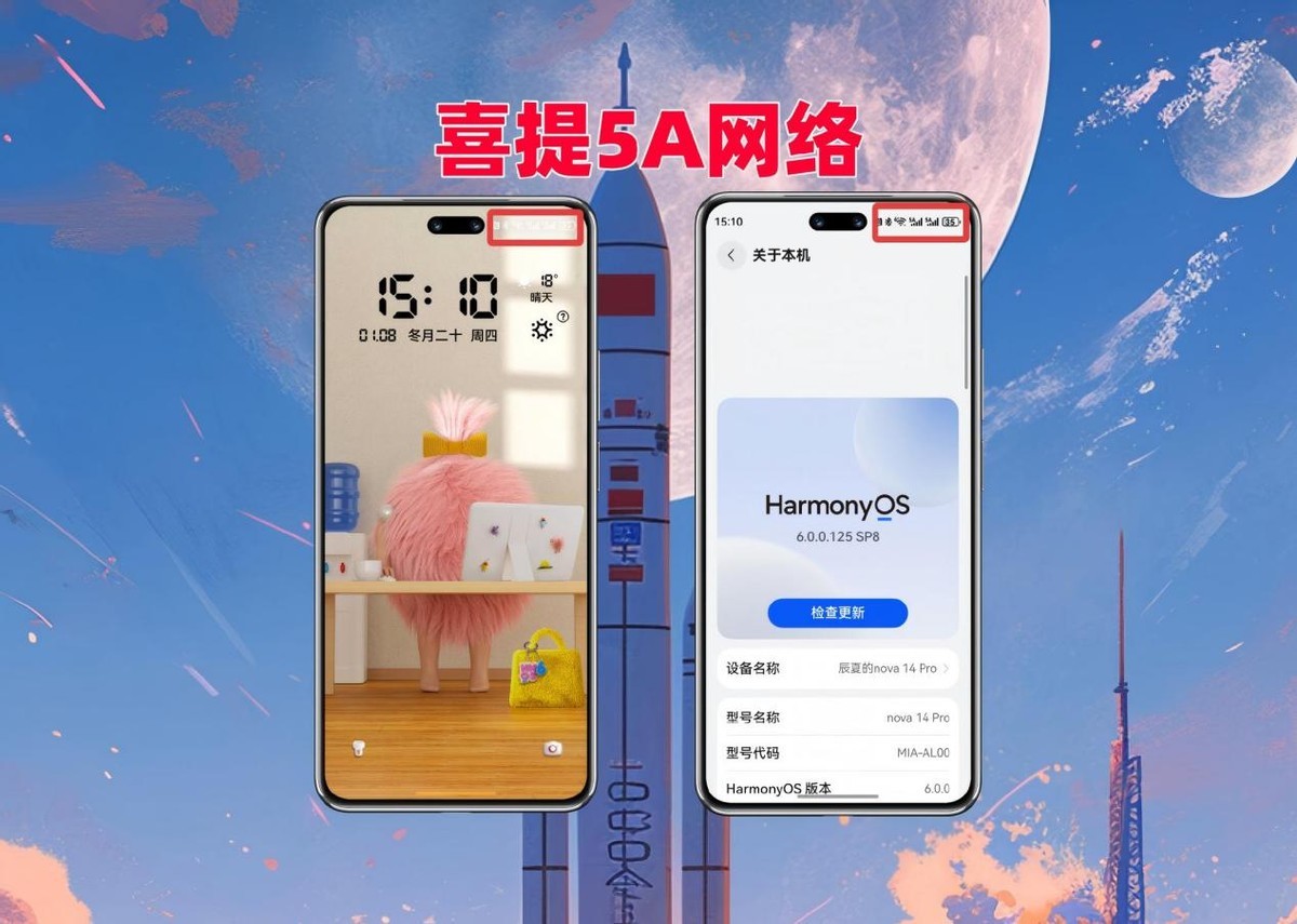 2026年1月7日开始,鸿蒙6.0.0.125版本开始大规模推送,本次新版本升级最大的看点无疑是5A网络。为了能早日喜提5A网络,手中的华为nova14Pro每天都会多次检查更新,终于在1月8日中午成功刷到了更新,第一时间升级到了鸿蒙6.0.0.125版本,升级后信号栏从无G升级到5A,终于用上了期待已久的5A网络。