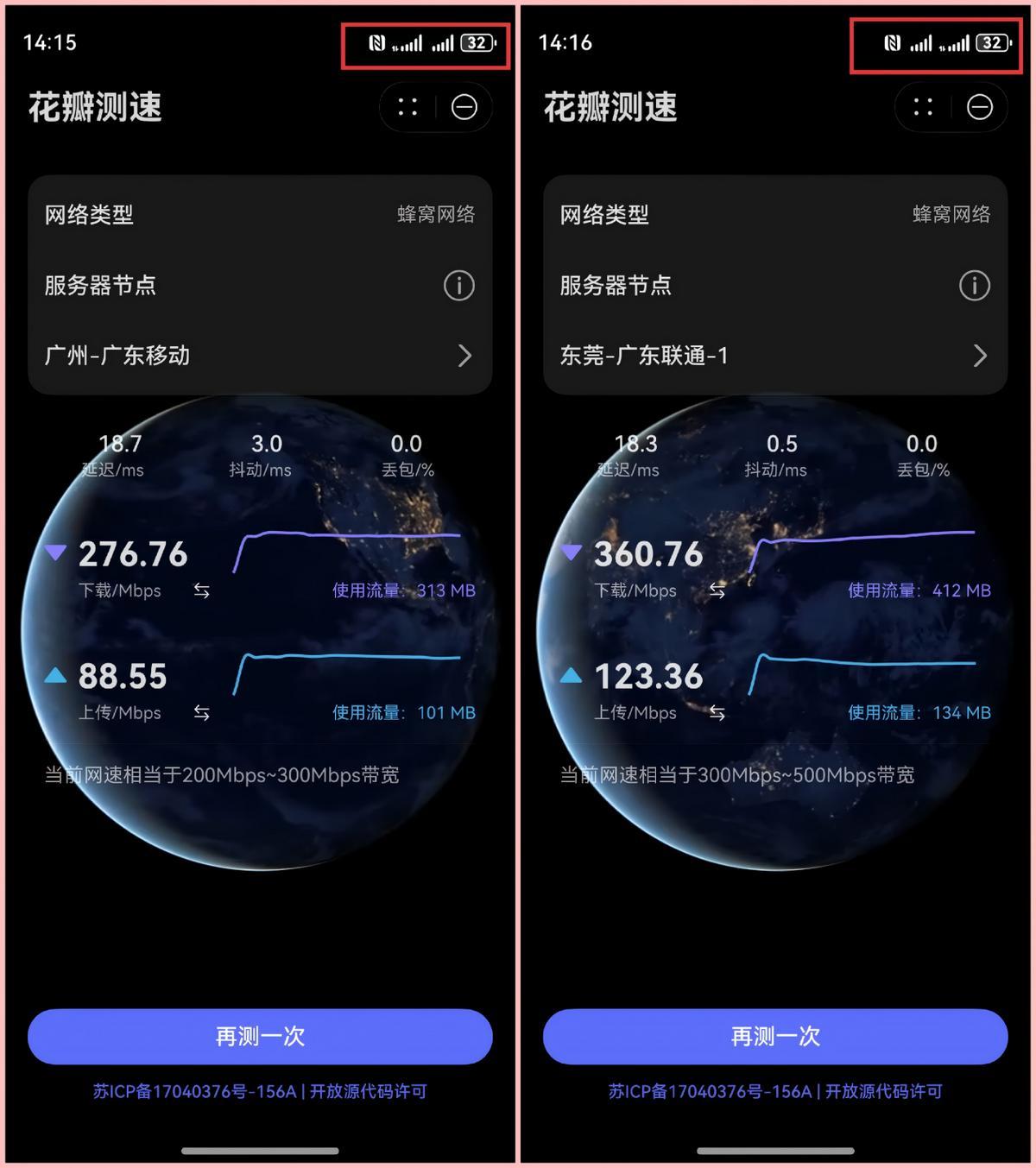 华为nova14Pro升级鸿蒙6.0.0.125前,我特意测试了一下网速,双卡待机状态,卡一移动(5G套餐,官方速率300M),卡二联通(5G套餐,官方速率300M)。关闭Wi-Fi,两张卡都属于无G状态,卡一移动实测下载276.76M上传88.55M,卡二联通实测下载360.76M上传123.36M。不管是卡一还是卡二,实测都是5G网速,移动接近跑慢,联通更是超出了官方速率。