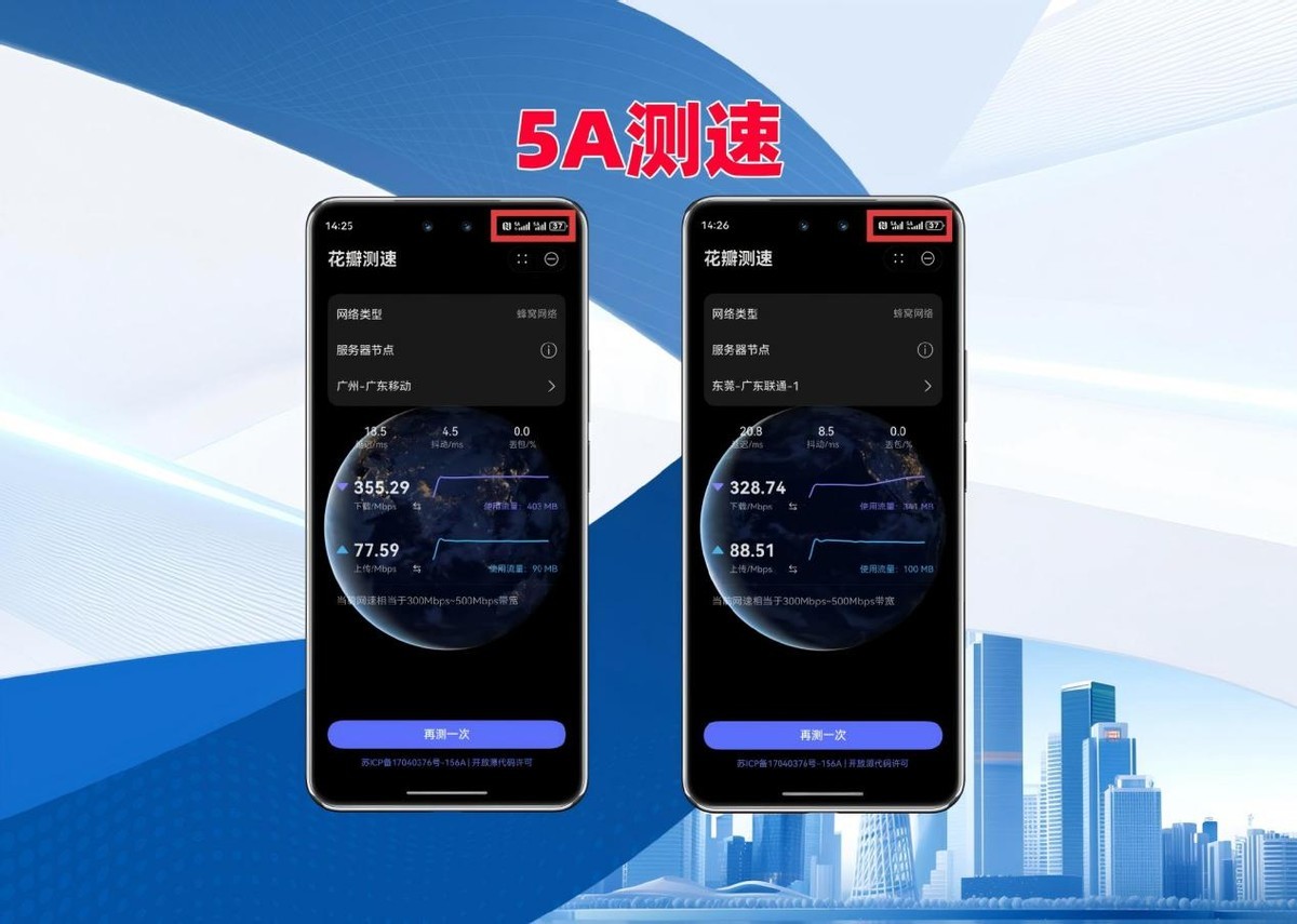 华为nova14Pro升级到鸿蒙6.0.0.125之后,信号栏从无G状态变成了5A,我们在同一地方关闭Wi-Fi再次测速,卡一移动实测下载355M上传77M,卡二联通实测下载328M上传88M。考虑到这种测试本身就存在较大的误差,从无G到5A,实测网速有升有降,属于正常的波动范围,并没有出现大幅提升。当然也有可能是手机套餐限制了网速,就好比学霸考100分,是因为试卷总分是100分,并不是学霸实力只有100分。