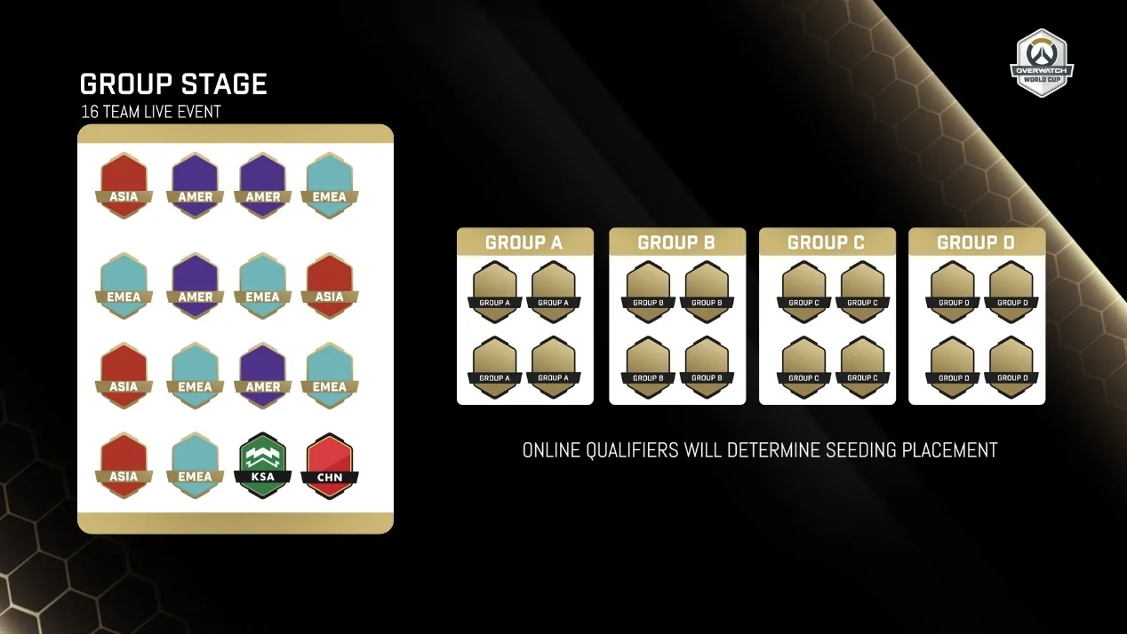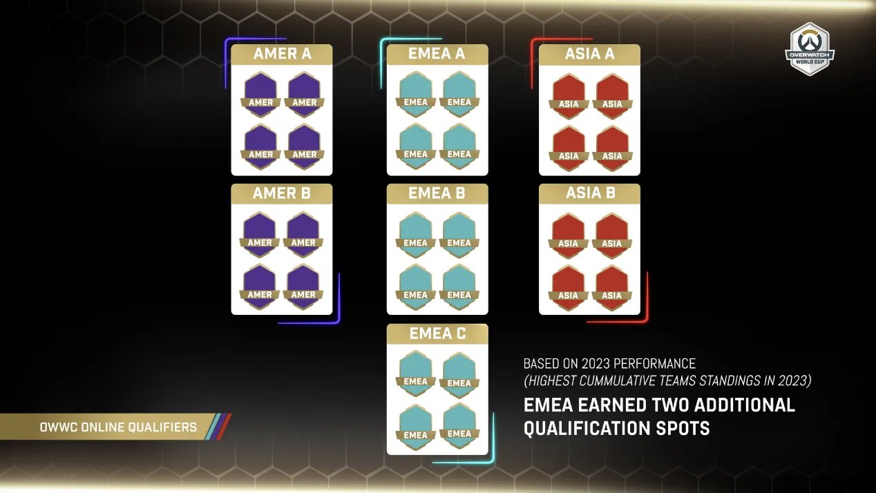 28支队伍在根据地理位置以及网络情况优化分组的赛区内竞争:美洲赛区A/B区、欧中非赛区A/B/C区、亚太赛区A/B区。每个赛区的前两名队伍将晋级小组赛,同时直通小组赛的有2023年OWWC的冠军沙特阿拉伯战队和亚军中国战队。