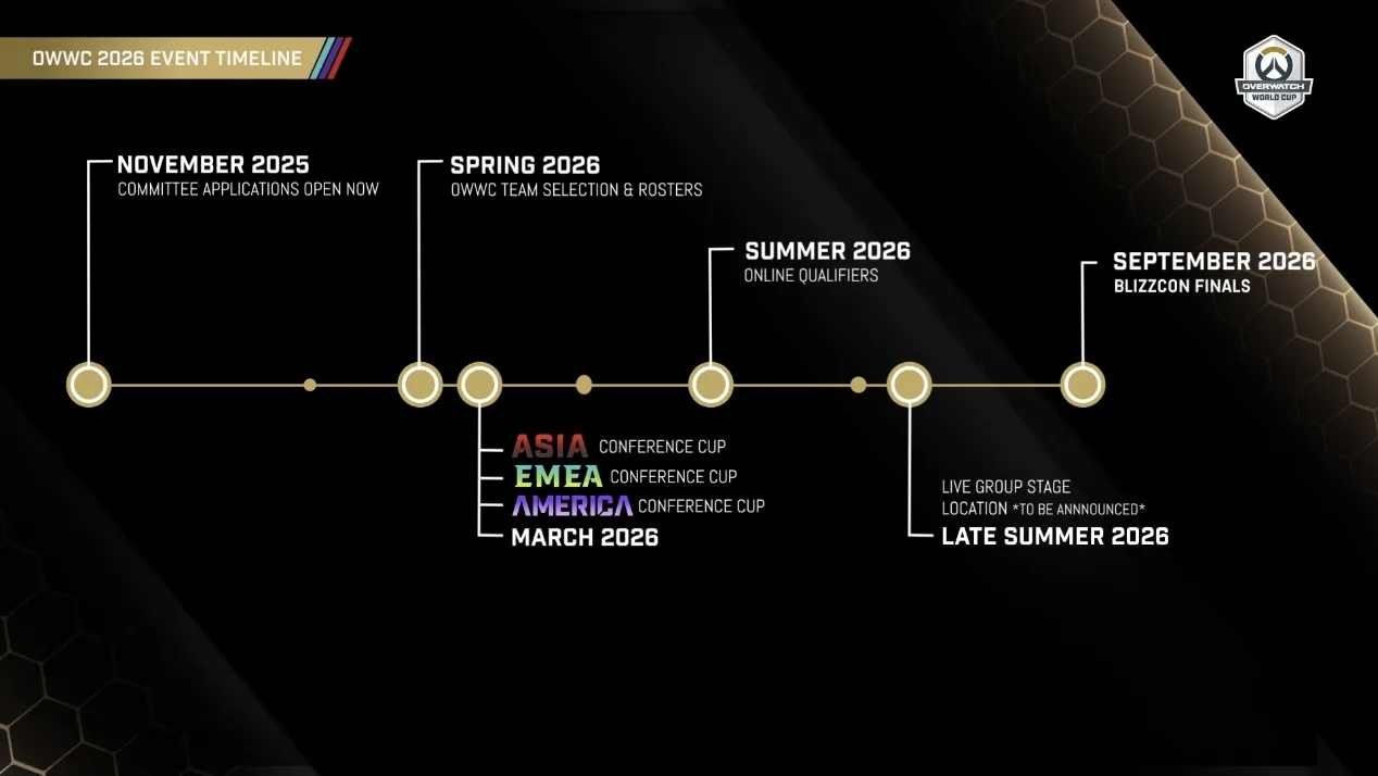 为庆祝《守望先锋》电竞十周年,守望先锋世界杯(OWWC)将于2026年重返暴雪嘉年华的安纳海姆会议中心体育馆。自2016年以来,OWWC汇聚了来自世界各地的英雄,加冕全球冠军。是新传奇崛起,还是卫冕冠军坚守阵地?敬请关注通往安纳海姆之路的精彩篇章,并了解2026年参赛队伍!