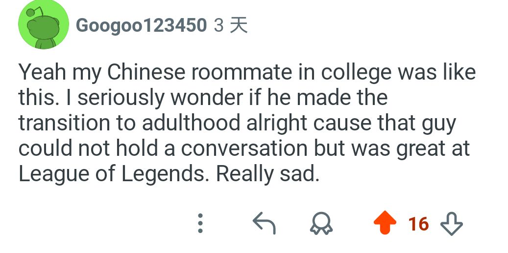 “我大学时的中国室友就是这样。我真的很怀疑他能否顺利过渡到成年生活——那家伙完全无法正常聊天,但玩《英雄联盟》是一把好手。真的很可悲。”