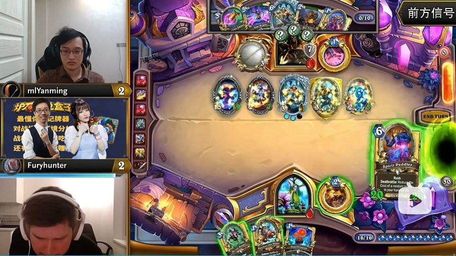 上图是决赛最后一回合的赛况:烟民手牌五张,牌库空了,场上五个随从,头上有个冰霜;