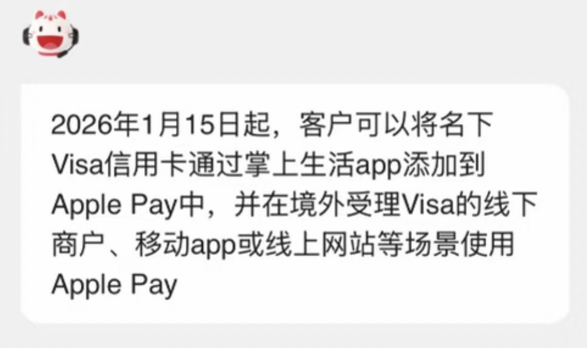 招行客服、公众号、掌上生活客服确认,招行将作为首批合作银行,于2026/1/15上线Visa Apple Pay服务!