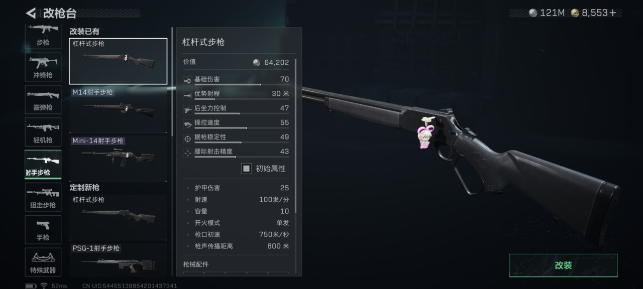 裸槍+改裝控制在20W(25W)及以內,不上降速度加傷害的犀牛槓桿,畢竟30m左右就會迎來第一波傷害衰減,並且開槍節奏很拖沓,還不如上蜂鳥猛猛扣扳機。
