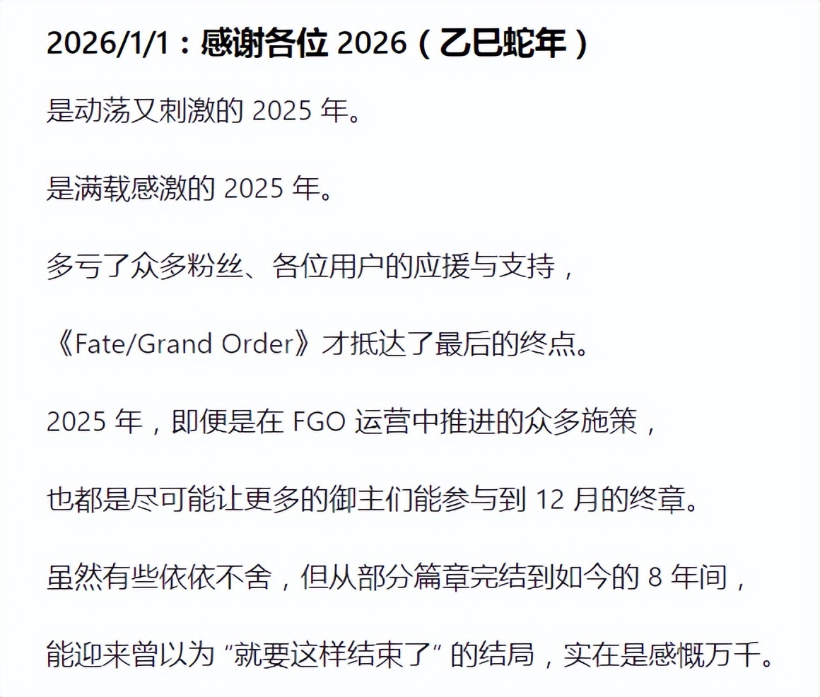所以大家应该能够理解为什么月球春晚全体月球人会如此心态爆炸——被刀的痛苦的时候告诉所有人这是一场梦,然后用重启结局把故事完结的毫无发展空间,再加上终章故事里一直不停地暗示2025年12月31号23点59分有大事发生,用二游运营最不能讲的“难道说?”拉起了全体玩家的期待,最后就高开低走跟窜稀一样拉了一地的广告,蘑菇还在最后火上浇油在博客里写上 FGO迎来了它的“最终的篇章”,那这谁还受得了?