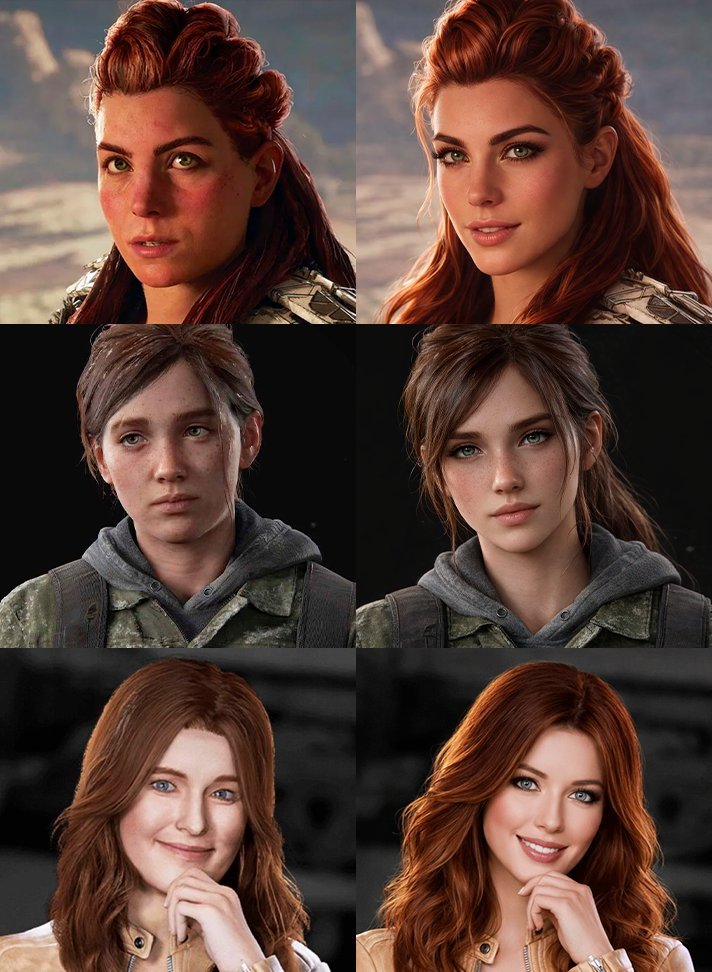 图中,《地平线》埃洛伊、《漫威蜘蛛侠》MJ,以及《最后生还者》艾莉都经过AI“化妆术”处理,AI抹平了“现实主义”瑕疵,毛孔、皱纹、不对称,统一“完美比例+性感妆容”。