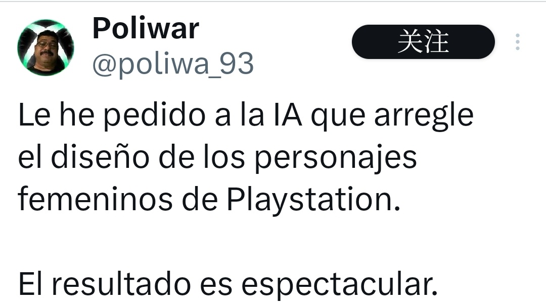 2026年1月9日,西班牙语游戏推主 @poliwa_93在X上发布了一张对比图,标题直白:“Le he pedido a la IA que arregle el diseño de los personajes femeninos de Playstation. El resultado es espectacular.”,我让AI修复了PlayStation的女性角色设计,结果太棒了!