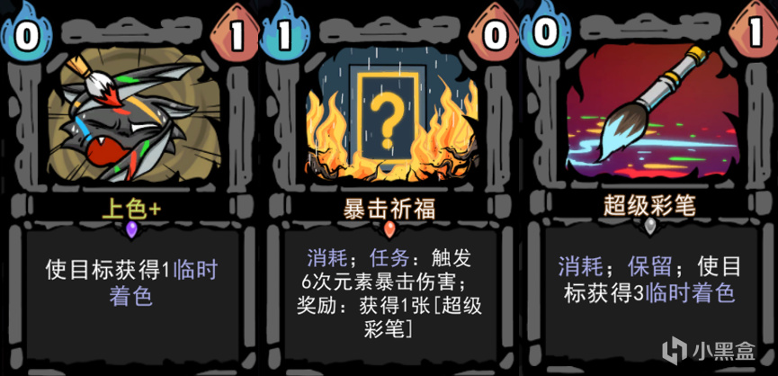 【超级彩笔】:这张强力衍生牌能一次性使目标获得3层着色,极大幅度提升本回合后续的元素附着效率,可以说打出后配合一轮循环就能起到一锤定音的效果。