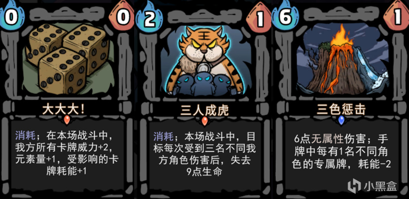 【三人成虎】:我方三人每打一圈,敌人额外掉9血。虽然跟这个套路配合不如和无属性脆弱配合强,但作为一个外挂对单策略卡是绝对可用的。2费只要触发2次就不亏了。