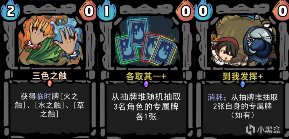 【各取其一】:直接从牌堆中抽取三人(也就是三种元素)卡牌各一张。本套路核心过牌手段,确保能迅速开启循环克制,避免旋律中断。