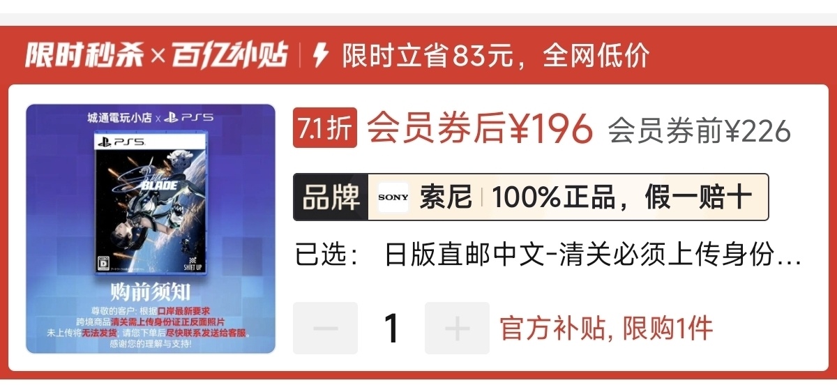 本周好价196元(-30积分券),史低日版193元(消费券)