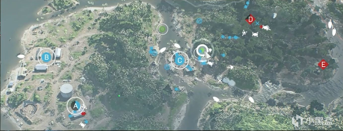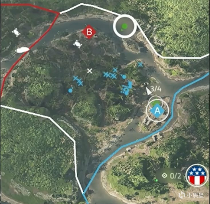 B點的位置設置是很有講究的。雖然地圖本身的征服模式做得也不錯,但從所羅門的一區以及三區B點的位置能看出來,這張地圖在設計之初就考慮到要面向突破和征服兩個模式。B點位於河道的轉彎處,且在AB之間佈置了大片有小路交叉的密林。繼續走水路進攻B點可行性不高,防守方在河流對岸可以部署兵力同時牽制河道和陸地,靠近B點的河道中心小島更是能發揮很強的阻擊作用。更何況美軍在這個區沒有了登陸艇,可用小艇數量也進一步減少,還離前線特別遠。