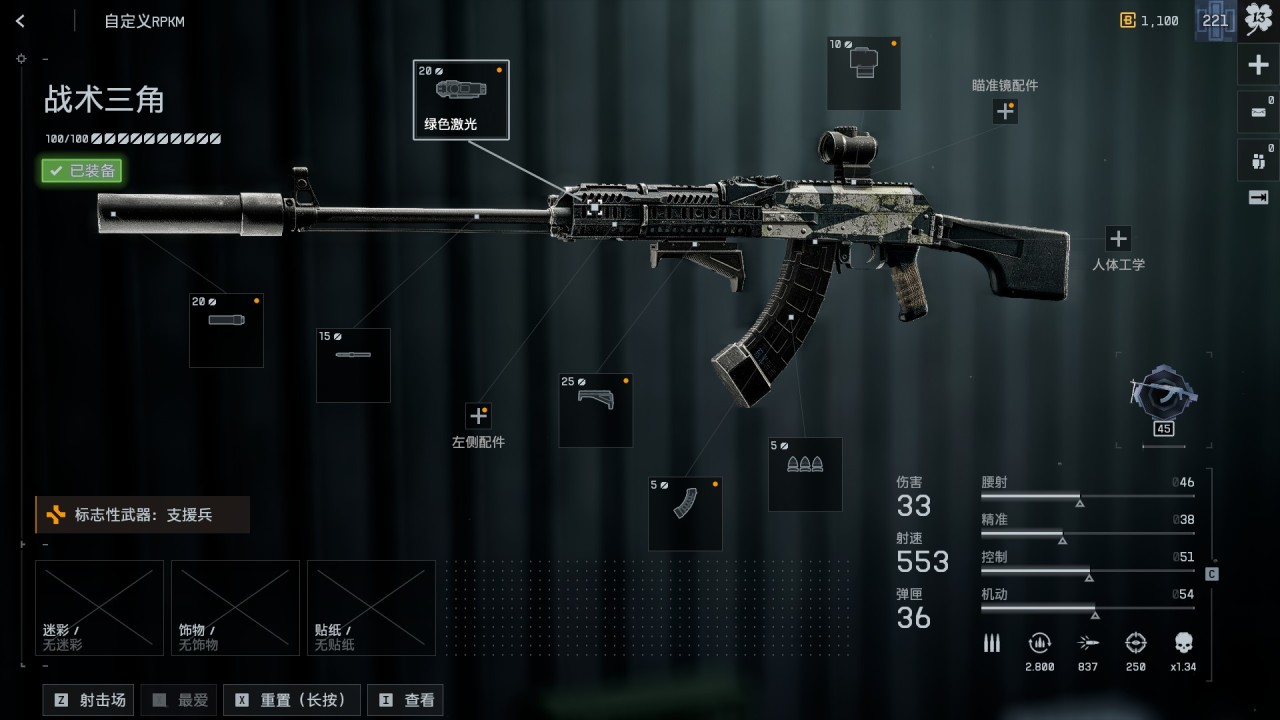 机动不行补机动,子弹飞行速度不行就补枪管,腰射不行就补激光,尽量做到性能没有拖后腿的地方,这样才更好发挥优势。