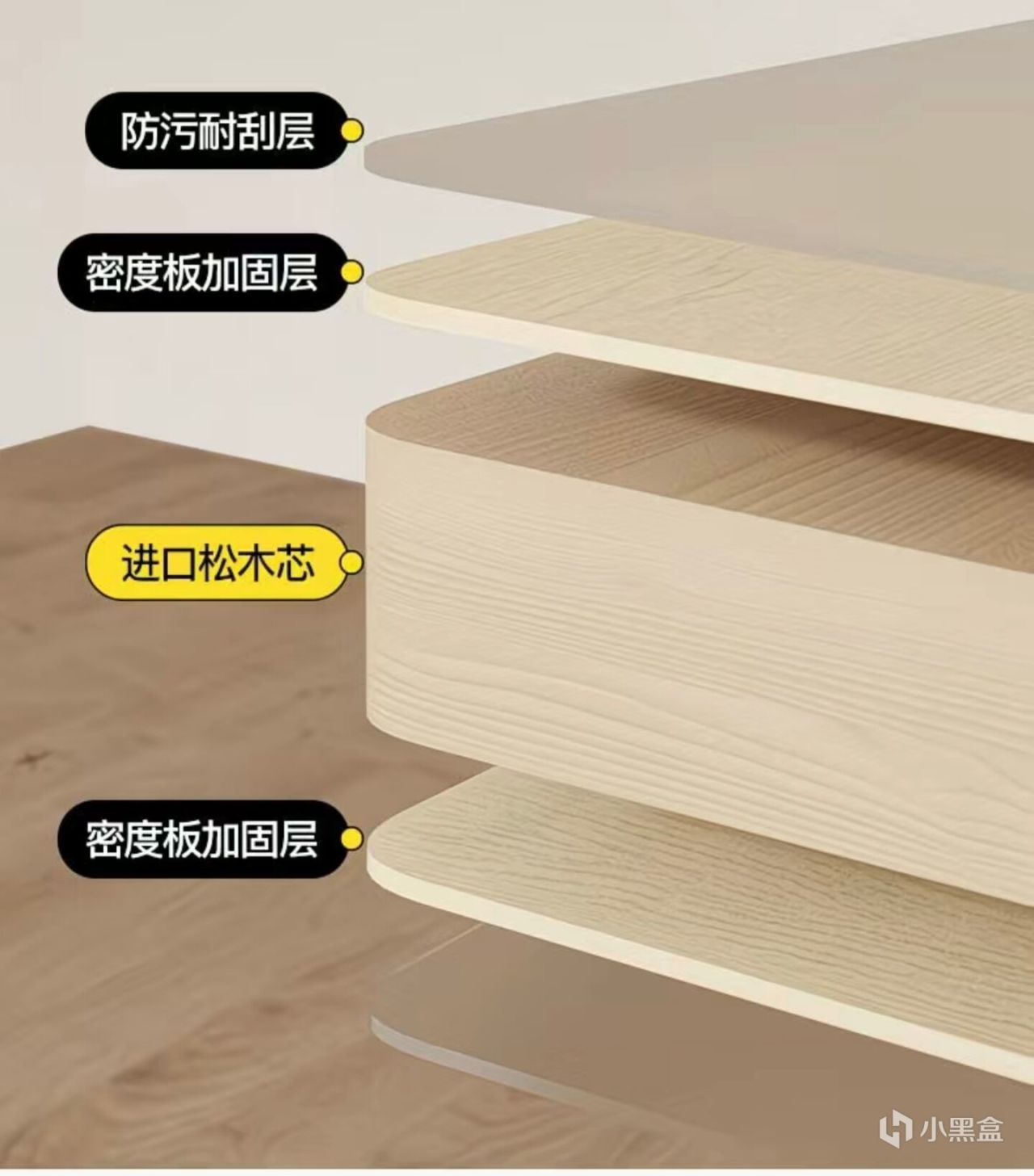 例如抖音里最热门的一款桌子的木材,这种密度板+松木芯+密度板的类三明治结构,表面也有三聚氰胺饰面纸。虽然能提升一定的强度,但他中间用到了密度板,同时又恰恰选了松木做板芯,他就会出现怕潮,握钉性能不强(密度板固有缺点)这就是为什么会有很多视频吐槽这个桌子会鼓包的原因。同时我还想吐槽一下他这个宣传,生态实木板是什么东西,生态板就生态板,实木就实木,干脆叫风味实木板不更好。