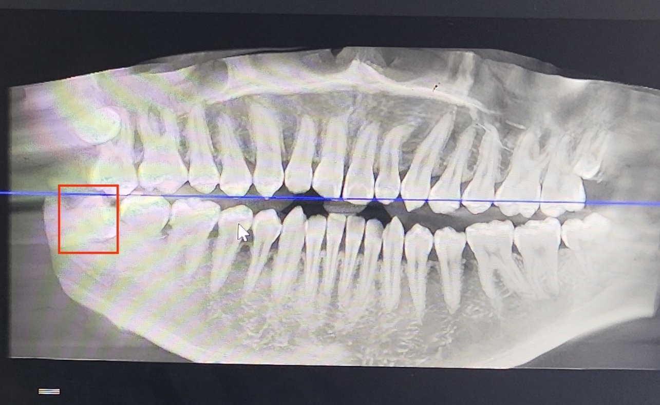 (右下的智齿已经不得不拔了,因为这颗是横向180°长出来的,已经顶到隔壁牙齿了)