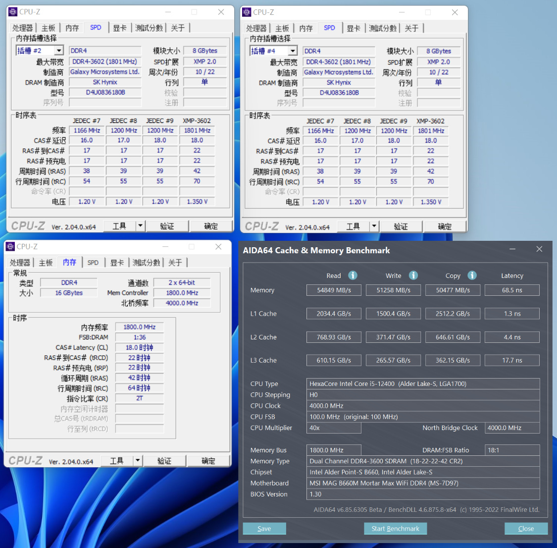 内存XMP状态,读取速度为54849 MB/s,写入速度为51258 MB/s,复制速度为50477 MB/s,延时为68.5ns;