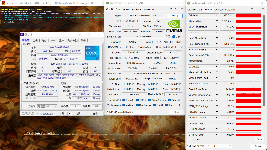 Furmark显卡烤机测试,机箱内环境,烤机25Min,显卡功耗稳定在250W左右,温度在66°左右;
