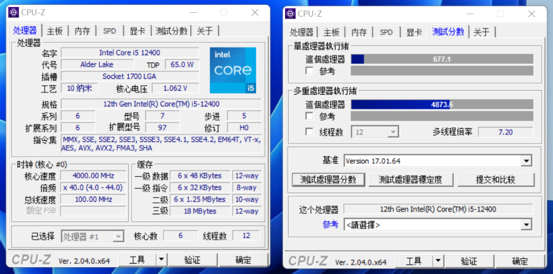 CPU-Z单核得分677.1分,多核得分4873.6分;