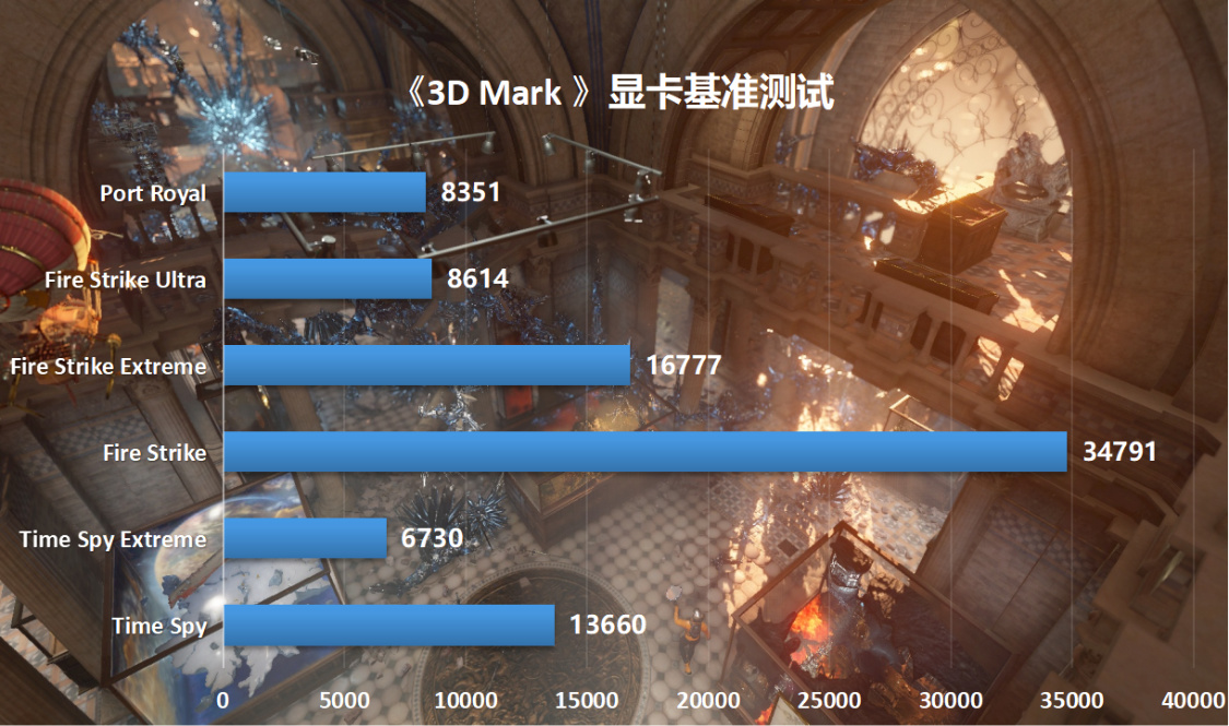 3D Mark测试,Time Spy测试,显卡得分13660分,Time Spy Extreme测试,显卡得分6730分,Fire Strike测试,显卡得分34791分,Fire Strike Extreme测试,显卡得分16777分,Fire Strike Ultra测试,显卡得分8614分;Port Royal光追测试得分8351分;