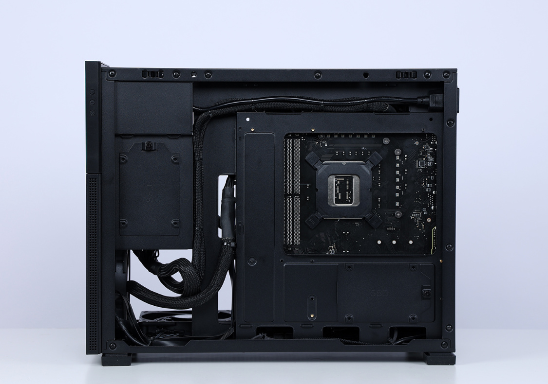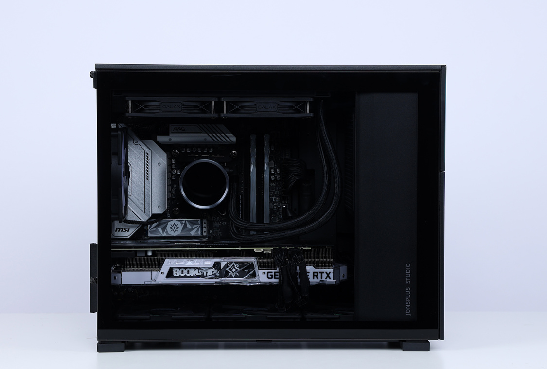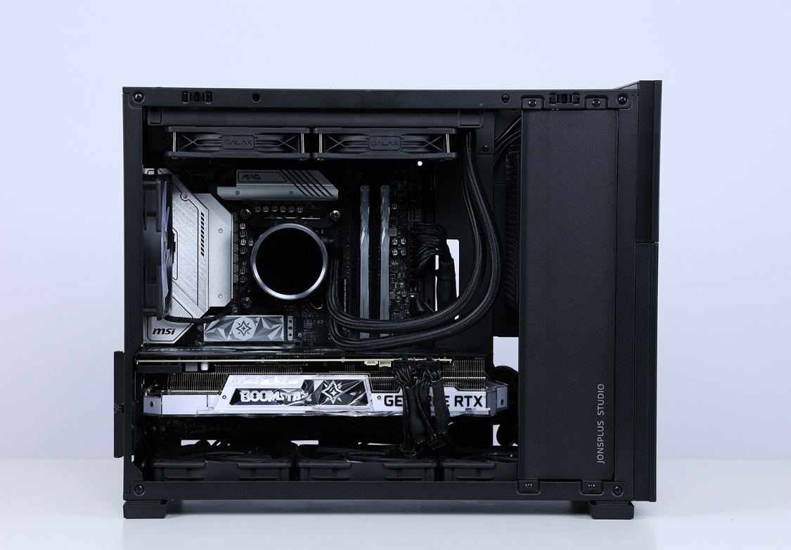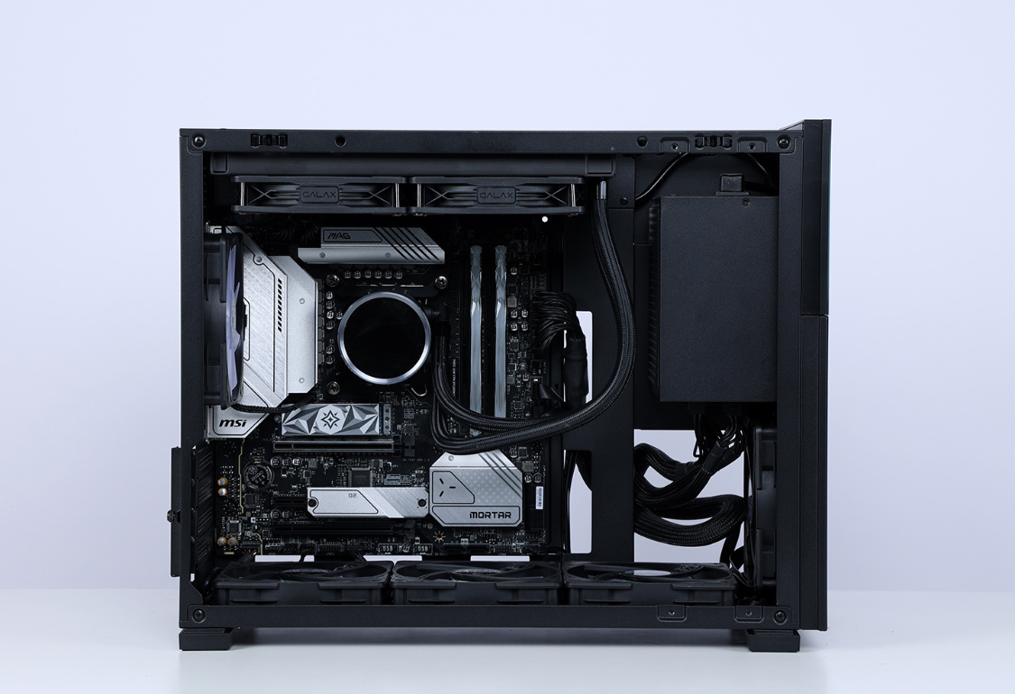 散热与电源全部装进机箱,并简单理下线。当然,为了避免机箱内积热,五把骨伽ARGB散热风扇也给安排上。