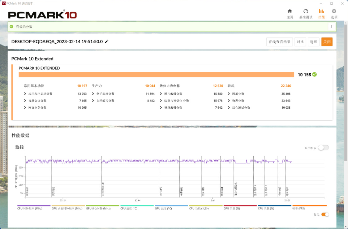 PC Mark Extended整机测试,整机得分10158分,常用基本功能得分10197分,生产力得分10044分,数为内容创作得分12630分,游戏得分22246分;