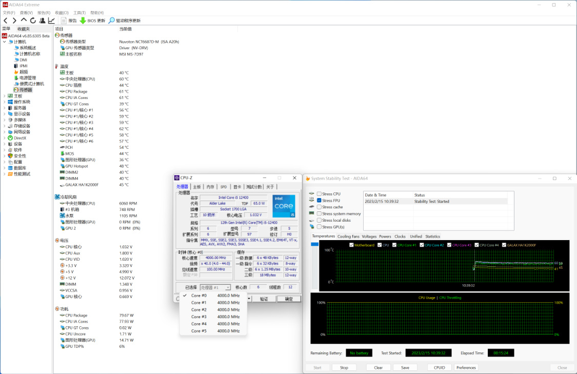 室温26°,机箱内环境,单烤FPU测试,烤机15Min+,CPU温度为60°左右,CPU功耗为80W左右;