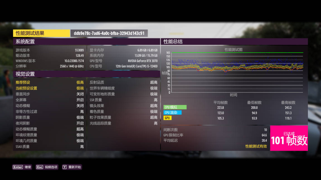 《极限竞速·地平线5》基准测试,2K分辨率,极端画质,光追为高,游戏平均帧率为101FPS: