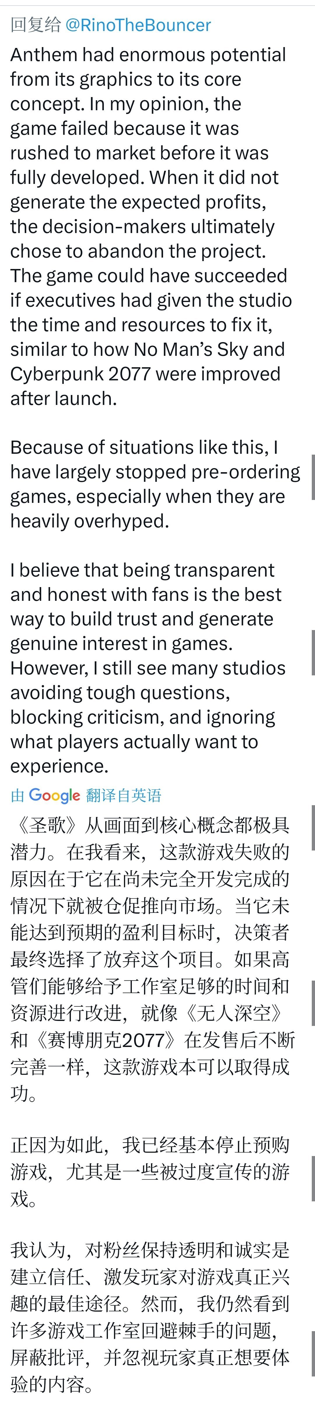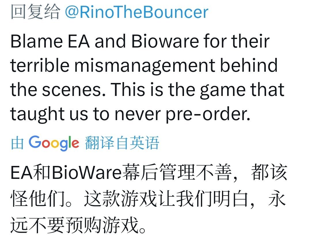 網友熱議:《聖歌》從畫面到核心概念都極具潛力。在我看來,這款遊戲失敗的原因在於它在尚未完全開發完成的情況下就被倉促推向市場。當它未能達到預期的盈利目標時,決策者最終選擇了放棄這個項目。如果高管們能夠給予工作室足夠的時間和資源進行改進,就像《無人深空》和《賽博朋克2077》在發售後不斷完善一樣,這款遊戲本可以取得成功。正因爲如此,我已經基本停止預購遊戲,尤其是一些被過度宣傳的遊戲。我認爲,對粉絲保持透明和誠實是建立信任、激發玩家對遊戲真正興趣的最佳途徑。然而,我仍然看到許多遊戲工作室迴避棘手的問題。屏蔽批評,並忽視玩家真正想要體驗的內容。我討厭《聖歌》,現在依然討厭,因爲在我看來,《聖歌》是BioWare走向衰落的罪魁禍首。一切都始於多年前的這款遊戲,而這家工作室自此之後就再也沒有完全恢復過來。
