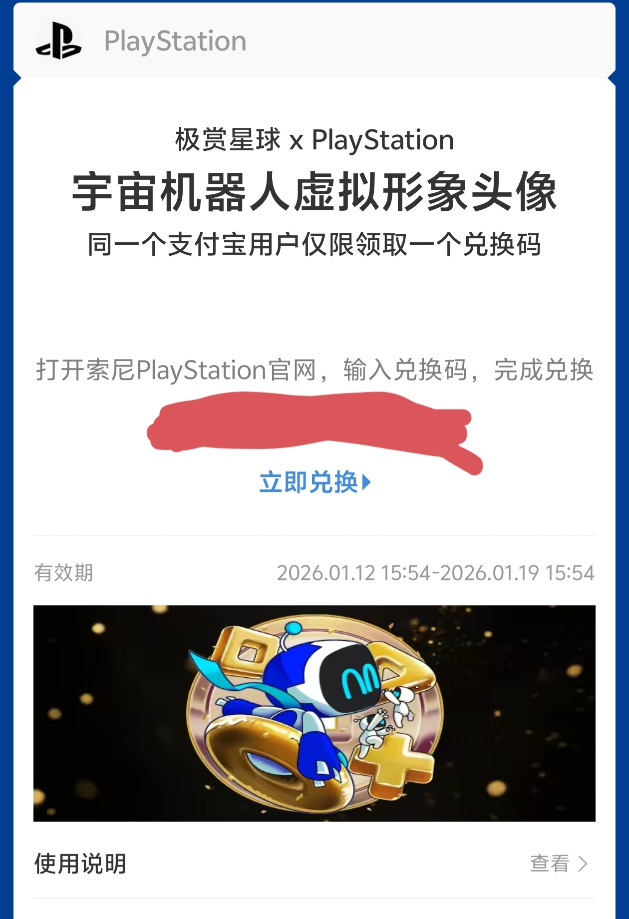 打开支付宝搜索“极赏星球”-点击小程序下PlayStation头像-进去同意授权后,不要滑动,当前页面最下面就是了-领取后去PS官网输入兑换码兑换。