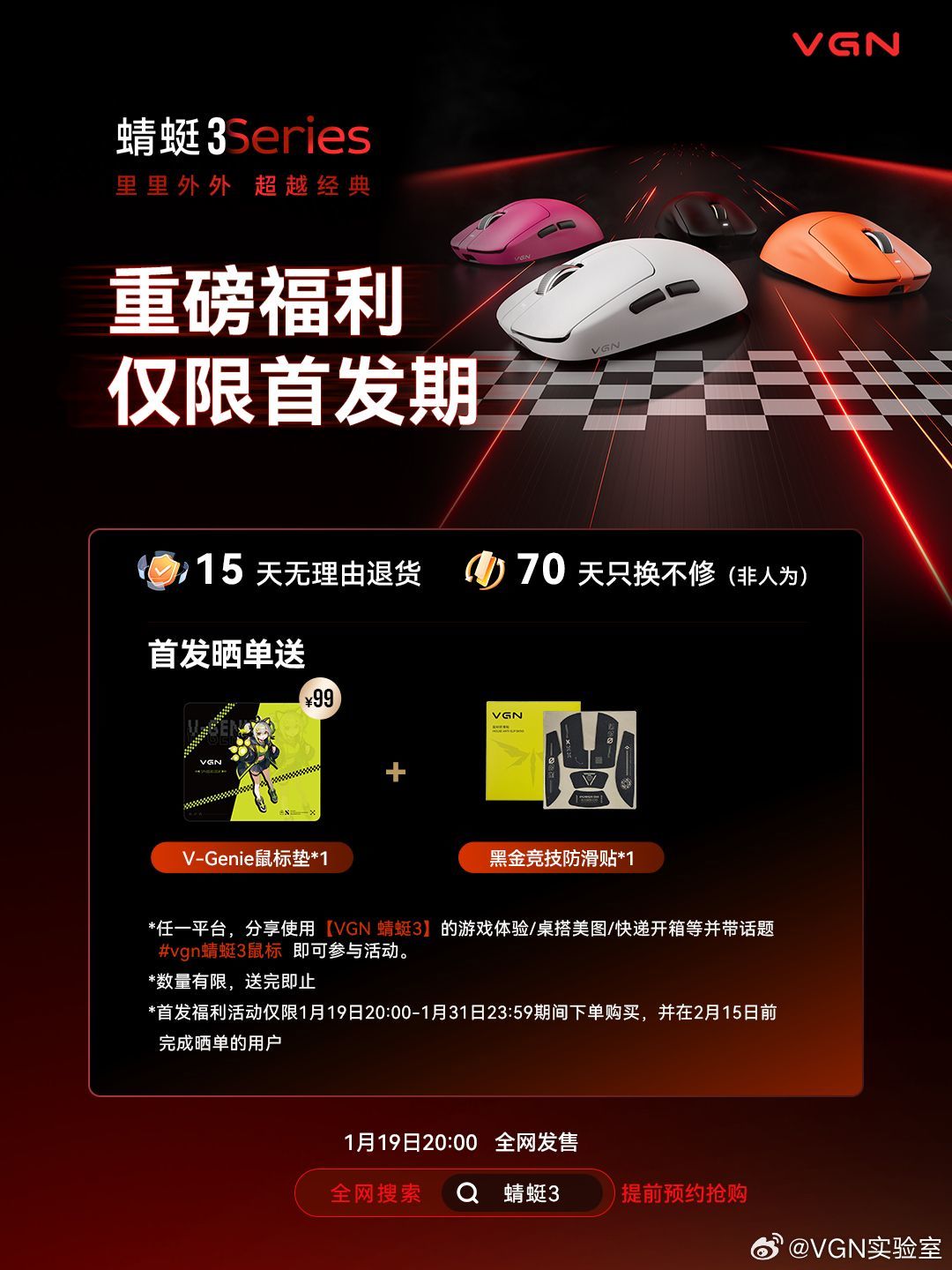 近日,VGN 蜻蜓 3 系列鼠标已正式开启预约,首发晒单赠送鼠标垫和防滑贴。
